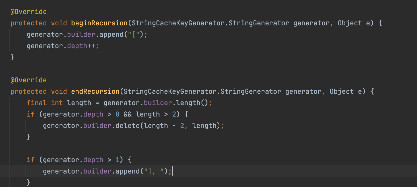 뭔가 StringCacheKeyGenerator 이것이 문제라고 생각되어졌다. key 를 생성하는 방식을 보니, StringBuilder 를 통해 [] 를 앞뒤로 붙여주고 있었다.