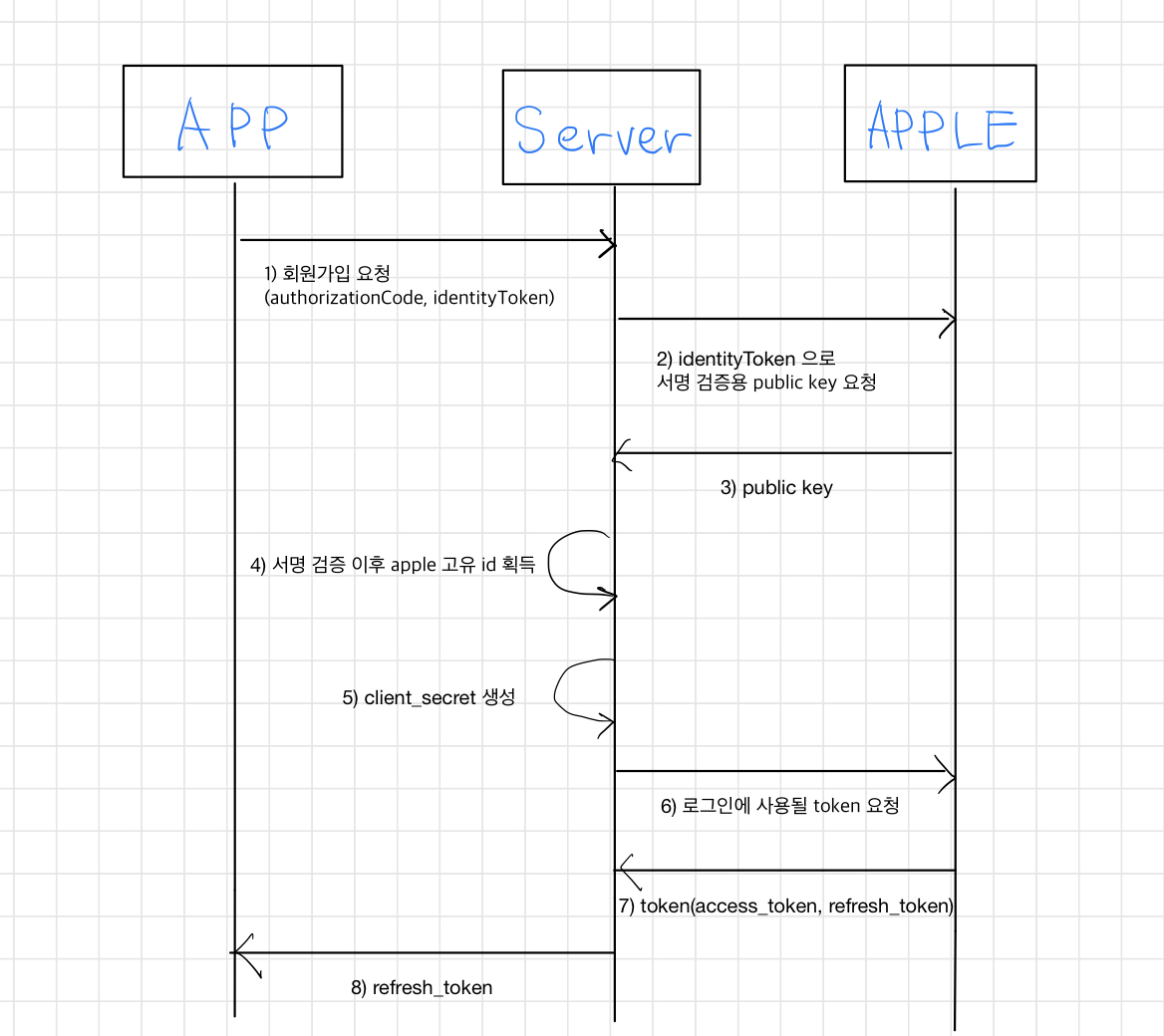 요청을 받으면 이제 진행해야할 것은, identityToken 을 검증하고 -> authorizationCode 로 apple 서버로부터 token 을 받아온 뒤 -> token 중에 refresh_token 을 검증하면 로그인 과정이 끝난다. 이렇게 작성해보면 간단해보이지만 하다보면 알 수 없는 에러들도 많이 만나게 된다. 이런 에러와 주의 사항은 중간에 추가로 작성을 해보겠다.